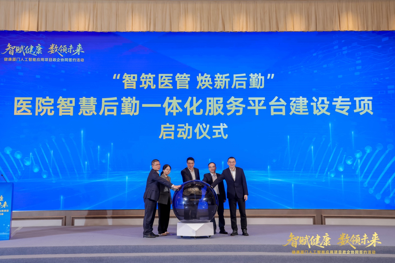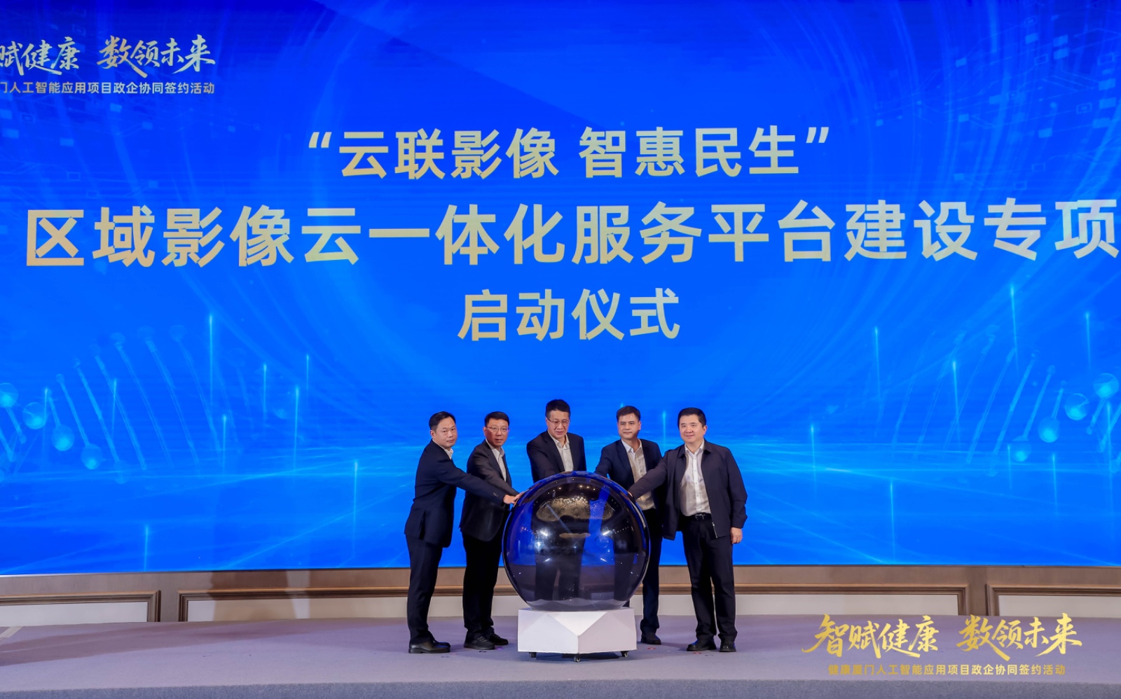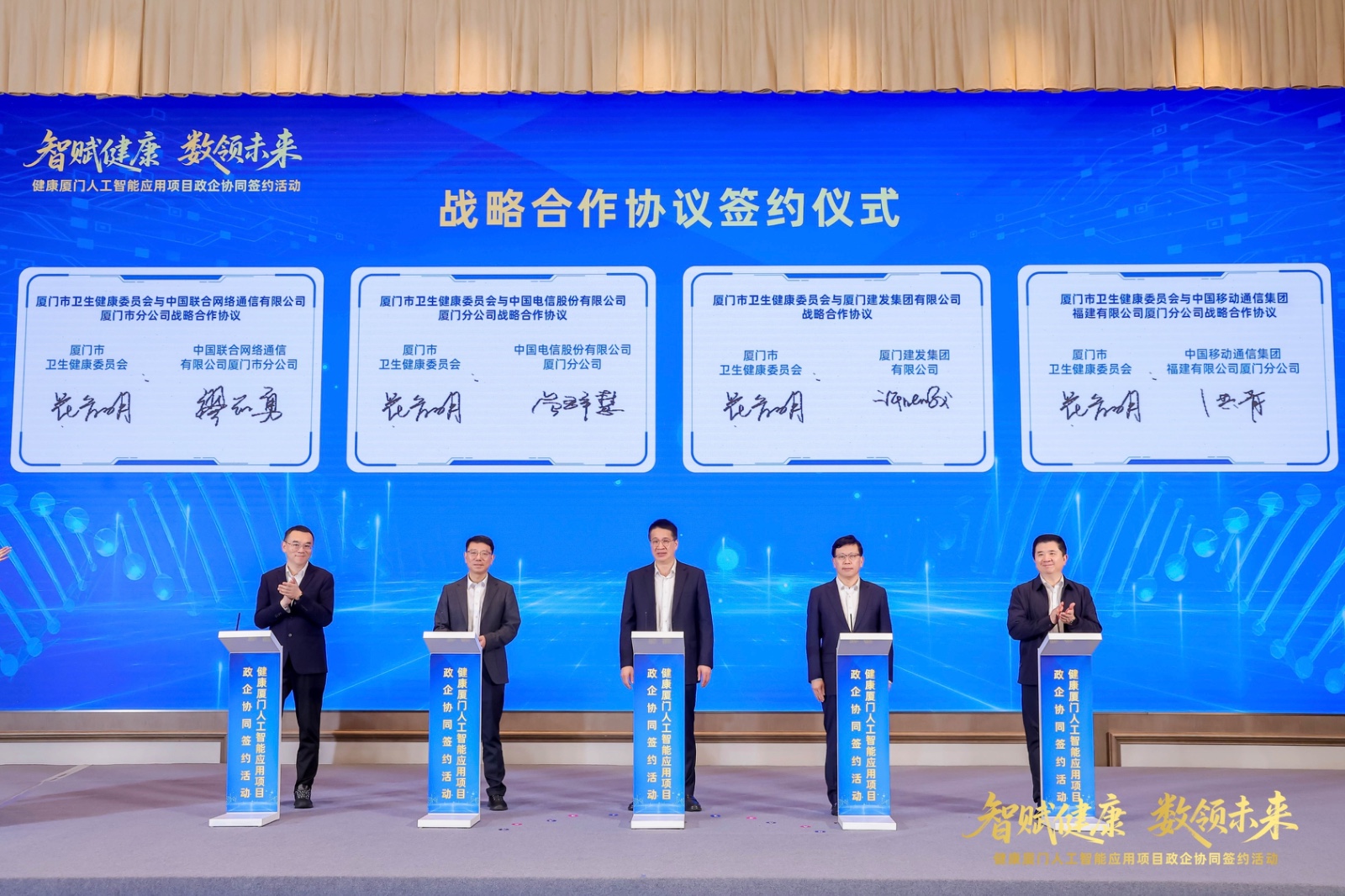 在簽約環(huán)節(jié),市衛(wèi)健委黨組書記、主任花育明,建發(fā)集團(tuán)黨委書記、董事長許曉曦,中國電信廈門分公司黨委書記、總經(jīng)理曾群慧,中國移動廈門分公司黨委書記、總經(jīng)理洪青,中國聯(lián)通廈門分公司黨委書記、總經(jīng)理繆志勇共同上臺簽署政企協(xié)同戰(zhàn)略合作協(xié)議?!八幒淖匪葜腔郾O(jiān)管(一碼通)平臺”、“區(qū)域影像云一體化服務(wù)平臺”、“醫(yī)院智慧后勤一體化服務(wù)平臺”三大人工智能應(yīng)用項目同步上線啟動。